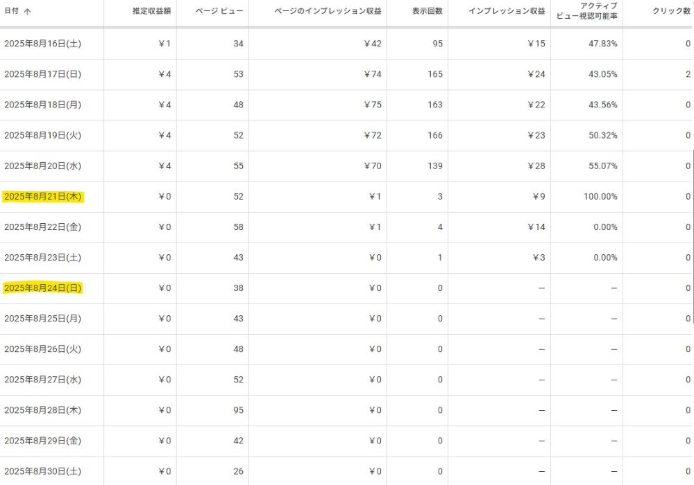 更に詳しい情報が確認できるGoogleアドセンスのウェブページ上のレポートを確認すると、8/21を境に推定収益額が0円、表示回数などの他の指標も激減し8/24からは0や空欄になっています。ページビューだけは以前と変わらず、問題の影響はなさそうです。