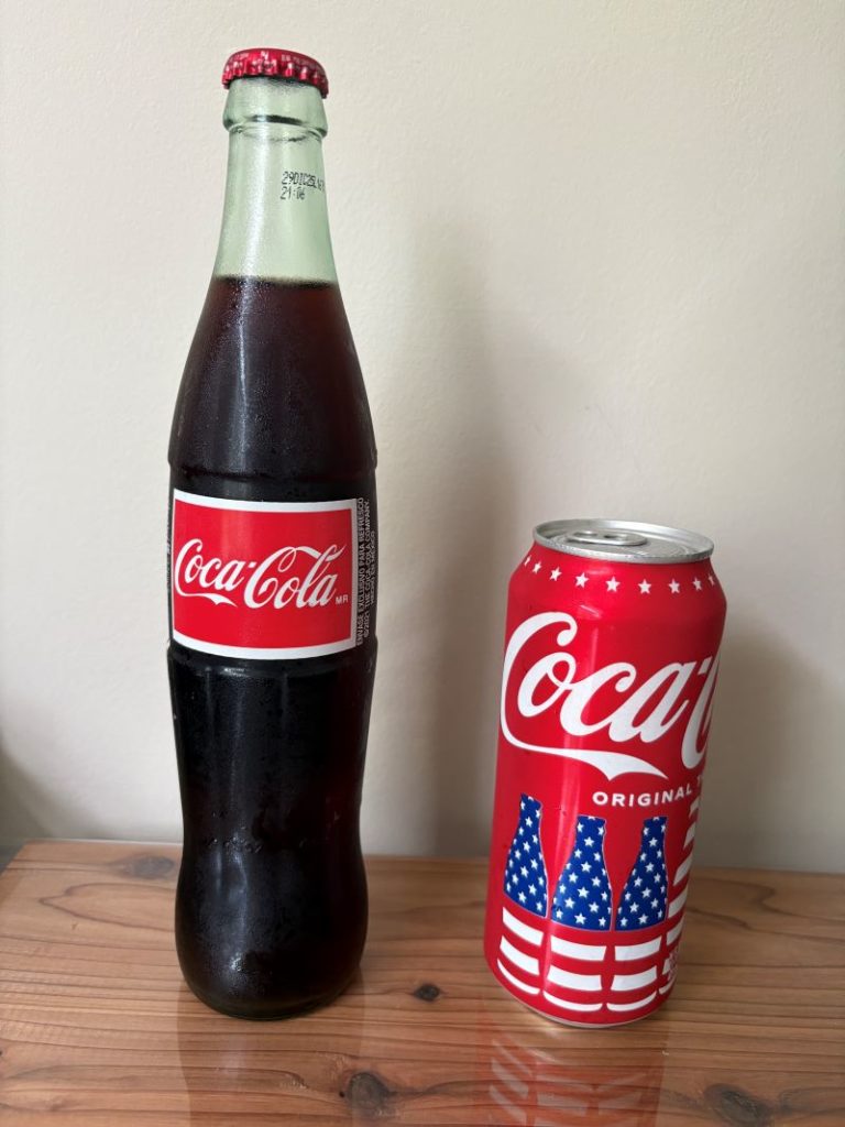 普通のアメリカのコカ・コーラは甘味料として人工甘味料のコーンシロップを使っている一方、メキシコのコカ・コーラはサトウキビから作られた天然の砂糖(cane sugar)を使っているため味が違うそうです。ちなみに日本で売っているコカ・コーラもまた異なっており、人工甘味料の果糖ぶどう糖液糖を使っています。